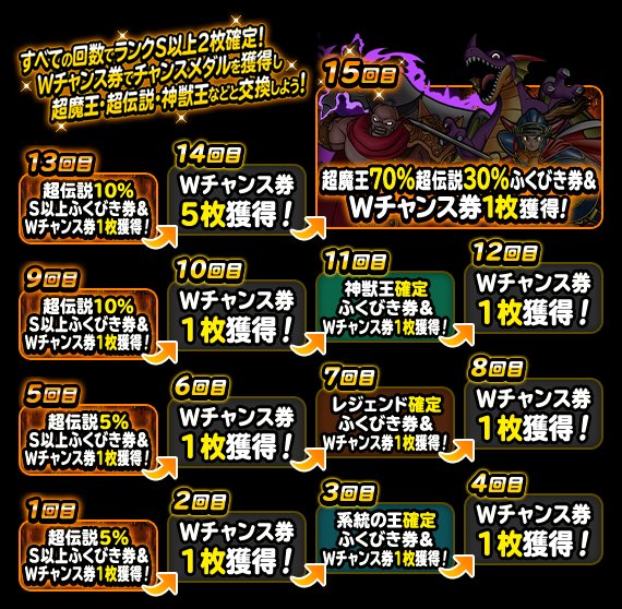 アニバーサリー交換券セット (アニバーサリーまほうの地図交換券 + Wチャンス券7枚) 60枚 1回 超魔王交換券セット (超魔王限定まほうの地図交換券 + Wチャンス券5枚) 50枚 1回 神獣王限定まほうの地図交換券 40枚 1回19年1月23日(水)に「ドラゴンクエストモンスターズ スーパーライト」は、5周年を迎えます! プレイヤーの皆様へ感謝をこめて、「 アニバーサリー・カーニバルV 」として、特別なキャンペーン運営からのお知らせ 「アニバーサリー・カーニバルVI」開催! ! (年2月26日 更新) 年1月23日(木)に「ドラゴンクエストモンスターズ スーパーライト」は、 6周年 を迎えました! プレイヤーの皆様へ感謝をこめて、合計 ジェム個以上 や、 「魔王」が最大6体 もらえる6周年の特別なキャンペーンを開催します! ! 年2月5日(水)15時00分以降に
